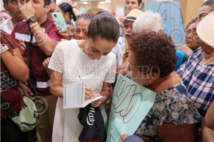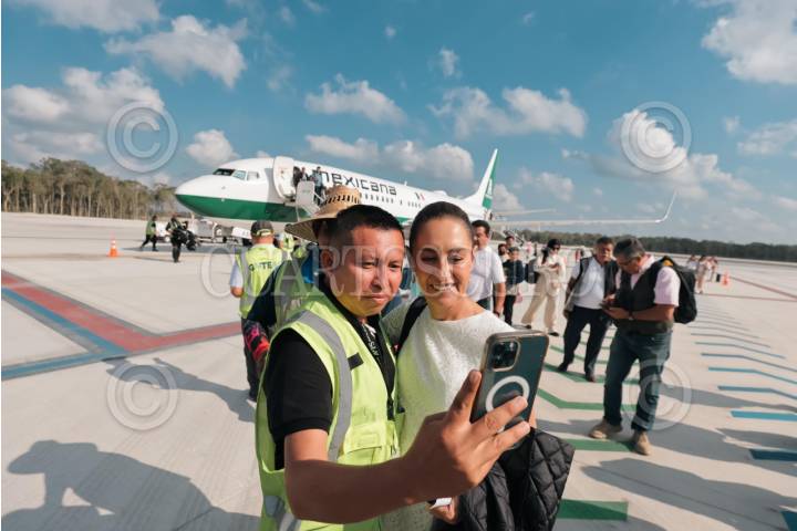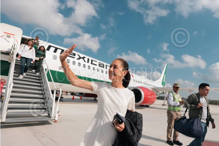 TULUM, QUINTANA ROO, 13MARZO2024.-Claudia Sheinbaum, candidata a la Presidencia de la República por la coalición Sigamos Haciendo Historia, durante su llegada al Aeropuerto Internacional Felipe Carrillo Puerto, previo a sus actividades de campaña en la entidad. FOTO: PRENSA CLAUDIA SHEINBAUM/CUARTOSCURO.COM