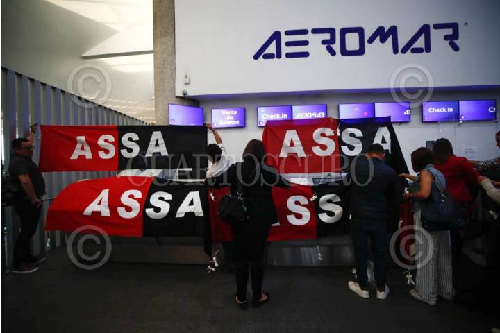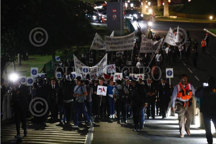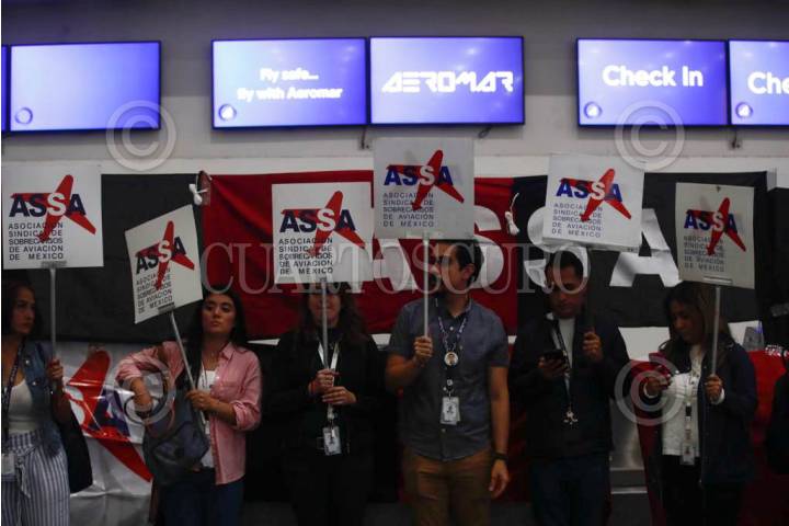 Empleados de Aeromar durante informe de huelga, tras suspender actividades de la aerolínea.