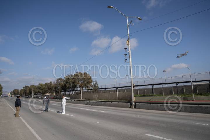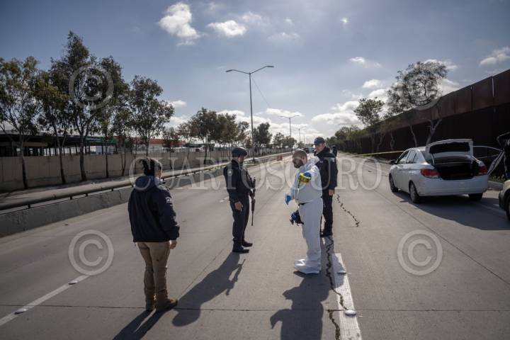 TIJUANA, BAJA CALIFORNIA 28ABRIL2025.- Sobre la Avenida Aeropuerto con dirección a la colonia Libertad, a metros del Aeropuerto Internacional de Tijuana, se registró una agresión armada que dejo el saldo de un hombre y una mujer sin vida, quienes se encontraban a bordo de un vehículo pick up Ford Lobo de color gris. Las unidades de emergencia arribaron al lugar de los hechos y localizaron a un hombre y una mujer lesionados por impactos de arma de fuego al interior del vehículo. Paramédicos de la Cruz Roja llegaron para brindarle los primeros auxilios a las víctimas, sin embargo, fueron declarados sin vida en el lugar. Según testigos, escucharon disparos a la altura del aeropuerto y visualizaron que los presuntos responsables viajaban a bordo de un vehículo tipo sedan de color blanco. En la zona se realizó un fuerte operativo policíaco, sin embargo, no hay registró de personas detenidas relacionadas a los hechos. Agentes de la Fiscalía y Servicios Periciales quedaron a cargo de la escena para realizar las investigaciones correspondientes. FOTO: OMAR MARTÍNEZ / CUARTOSCURO.COM