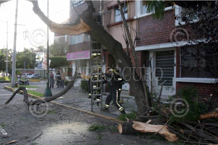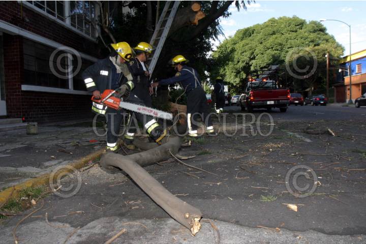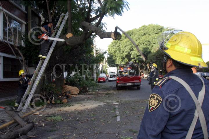 MÉXICO, D.F. 25OCTUBRE2007.- En las calles de Patricio Sainz y Porfirio Diaz en la colonia del Valle, una camioneta de carga tiro un árbol afectando a otro vehiculo, en la imagen bomberos y elelmentos de proteccion civil cortan el árbol. FOTO: PEDRO MARRUFO/CUARTOSCURO.COM