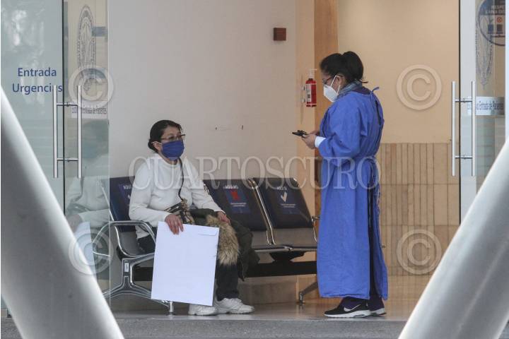 Familiar y personal médico a las afueras del área de urgencias del Hospital de Nutrición.