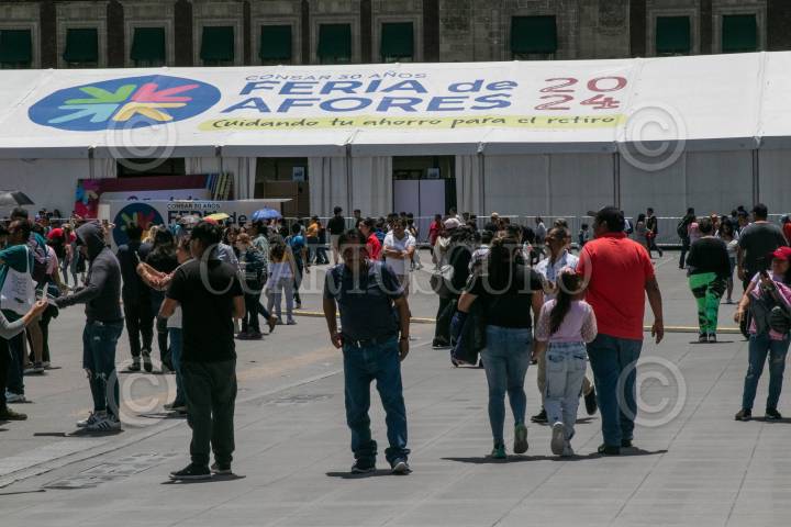 CIUDAD DE MÉXICO, 18JULIO2024.- Cientos de personas acudieron a realizar trámites durante la Feria de Afores 2024 en la plancha del Zócalo, la cual se llevará a cabo del 18 al 21 de julio. FOTO: GRACIELA LÓPEZ/CUARTOSCURO.COM