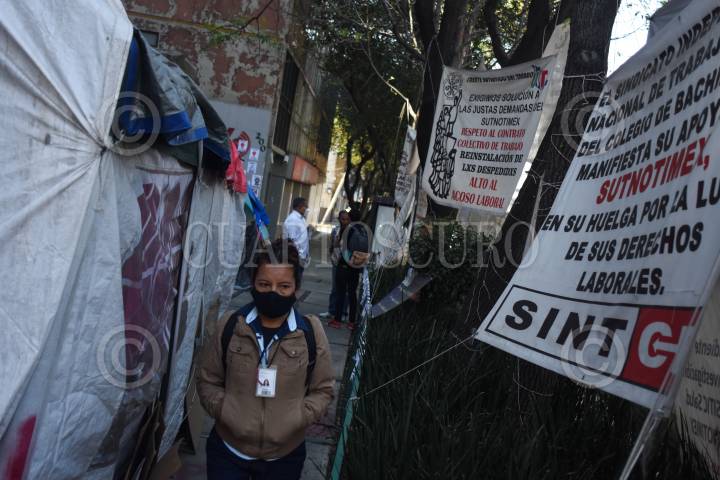 Trabajadores de Notimex mantienen un plantón afuera de las instalaciones de Notimex.