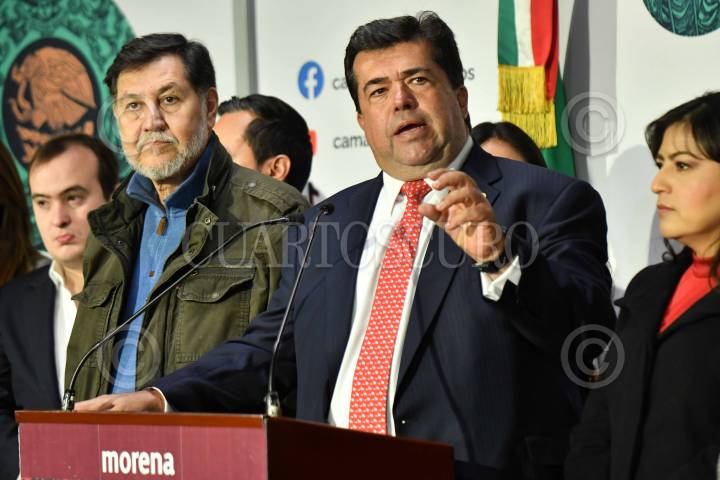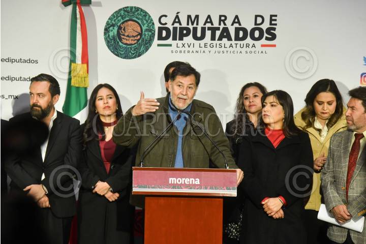 CIUDAD DE MÉXICO, 08ENERO2025.- Gerardo Fernández Noroña, presidente de la mesa directiva del Senado de la República, y legisladores de la mayoría, ofrecieron conferencia de prensa, para referirse a temas de la agenda política y que serán discutidos en la primera sesión ordinaria de la Comisión Permanente del Congreso de la Unión. FOTO: MARIO JASSO/CUARTOSCURO.COM