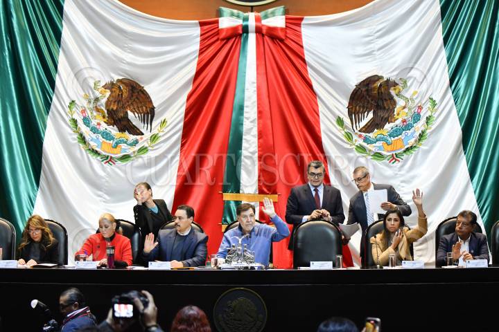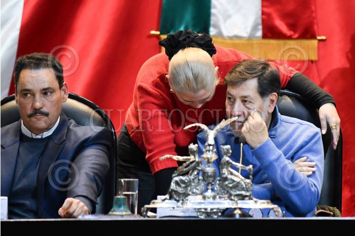 CIUDAD DE MÉXICO, 08ENERO2025.- Gerardo Fernández Noroña, presidente de la mesa directiva, junto a los legisladores: Laura Ivonne Ruíz; Verónica Camino; Juan Antonio Martín; Fryda Marybel Villegas, y Oscar Bautista, durante la primera sesión ordinaria de la Comisión Permanente del Congreso de la Unión, en la que se realizaron posicionamientos y se decretó la declaratoria de reforma constitucional del dictamen quebprohíbe el uso de vapeadores y el uso ilícito de fentanilo, y discusión de la agenda política: pronunciamiento relativo a las declaraciones del Presidente electo de los Estados Unidos de América, Donald Trump. FOTO: MARIO JASSO/CUARTOSCURO.COM