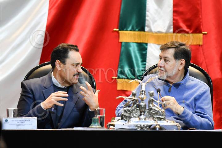 CIUDAD DE MÉXICO, 08ENERO2025.- Juan Antonio Martín, senador del PAN y Gerardo Fernández Noroña, presidente de la mesa directiva, durante la primera sesión ordinaria de la Comisión Permanente del Congreso de la Unión, en la que se realizaron posicionamientos y se decretó la declaratoria de reforma constitucional del dictamen que prohíbe el uso de vapeadores y el uso ilícito de fentanilo, y discusión de la agenda política: pronunciamiento relativo a las declaraciones del Presidente electo de los Estados Unidos de América, Donald Trump. FOTO: MARIO JASSO/CUARTOSCURO.COM