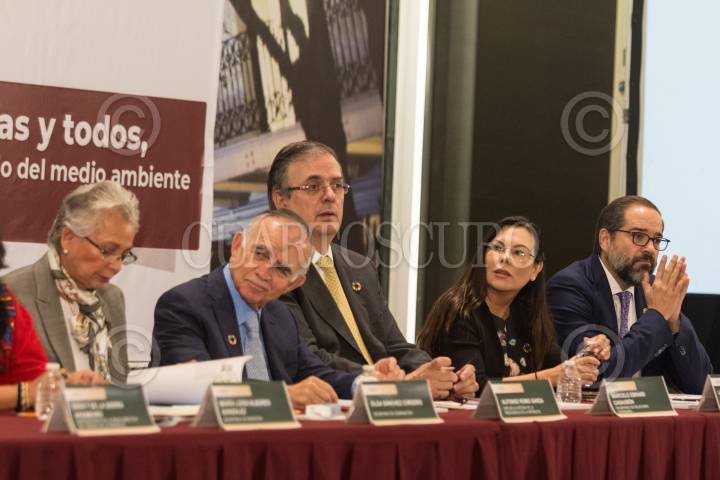 Olga Sánchez Cordero, Alfonso Romo Garza, Marcelo Ebrard Casaubón, Laura Roas Hernández, Abel Hibert Sánchez, Nancy de la Sierra Arámburo, María Luisa Albores, secretaria de Bienestar e Ignacio Peralta Sánchez, durante el Lanzamiento de la Estrateg