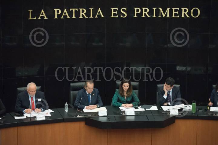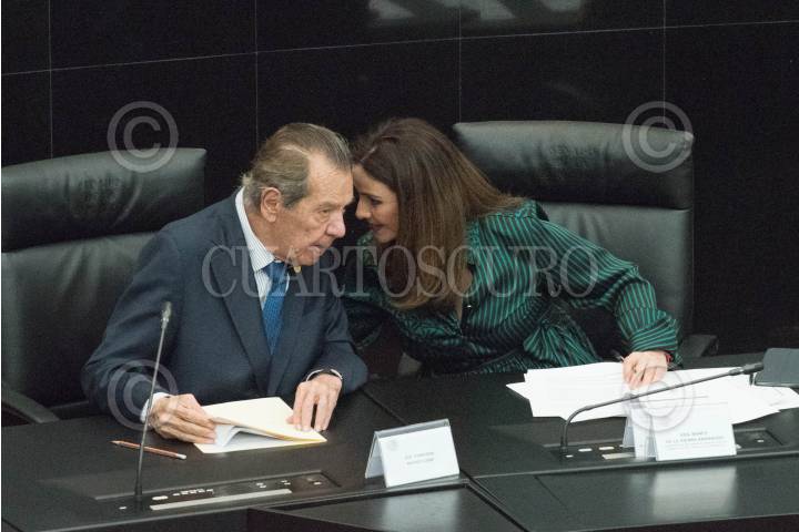 CIUDAD DE MÉXICO, 12JUNIO2019.- Porfirio Muñoz Ledo, presidente de la directiva de la Cámara de Diputados, y Nancy de la Sierra Aramburo, senadora del PT, durante la realización del foro Las tres dimensiones del desarrollo: una oportunidad para legislar con futuro en México, como parte de las actividades del Grupo de Trabajo de la Agenda 2030 en el Senado de la República. FOTO: MARIO JASSO /CUARTOSCURO.COM
