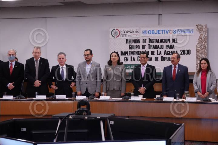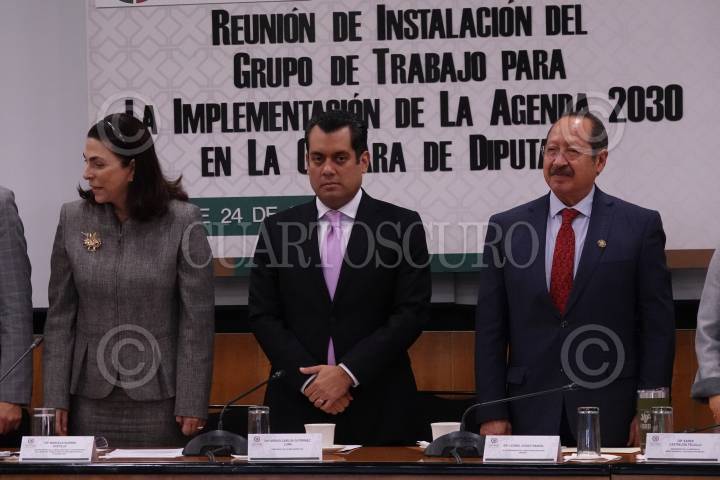 Marcela Guerra Castillo, Sergio Carlos Gutiérrez Luna y Leonel Godoy Rangel durante la instalación del Grupo de Trabajo para la Implementación de la Agenda 2030 en la Cámara de Diputados.