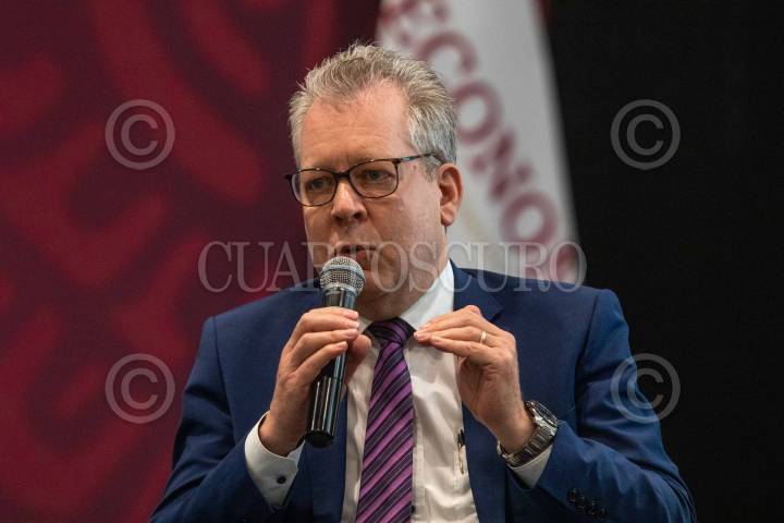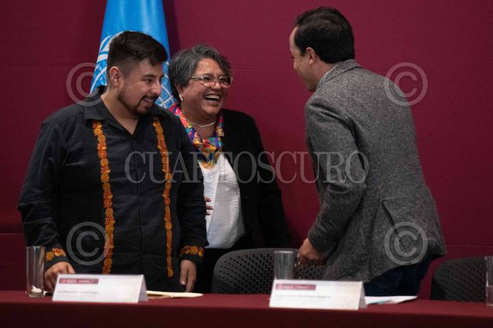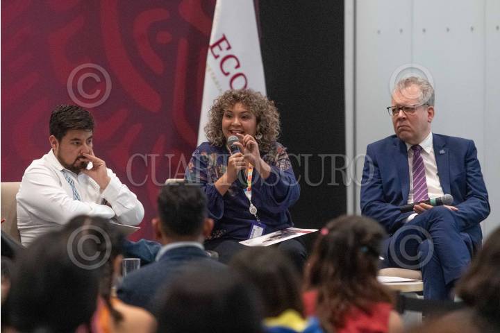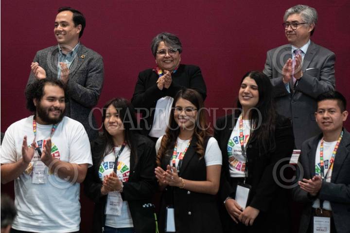 CIUDAD DE MÉXICO, 06OCTUBRE2023.- Raquel Buenrostro Sánchez, secretaria de Economía; Alejandro Encinas Nájera, subsecretario de Comercio Exterior, en México; Joel Hernández García, subsecretario para Asuntos Multilaterales y Derechos Humanos de la Secretaría de Relaciones Exteriores, y jóvenes embajadores de la Primera Convención Nacional por la Agenda 2030. FOTO: MARIO JASSO/CUARTOSCURO.COM