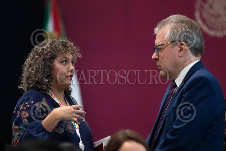 Irais Barreto Canales, titular de la Unidad de Inteligencia Económica Global y Secretaria Ejecutiva del Consejo Nacional de la Agenda 2030, y Peter Grohmann, coordinador residente del Sistema de Naciones Unidas en México, durante del lanzamiento de la convocatoria para la "Red Juvenil por la Agenda 2030".