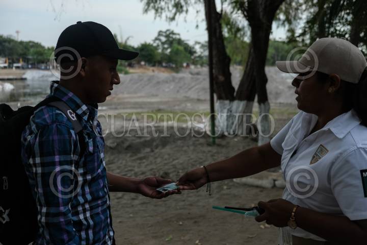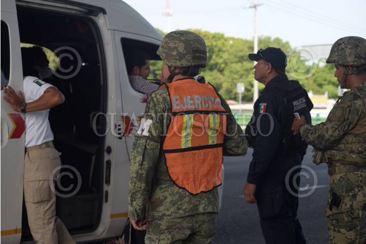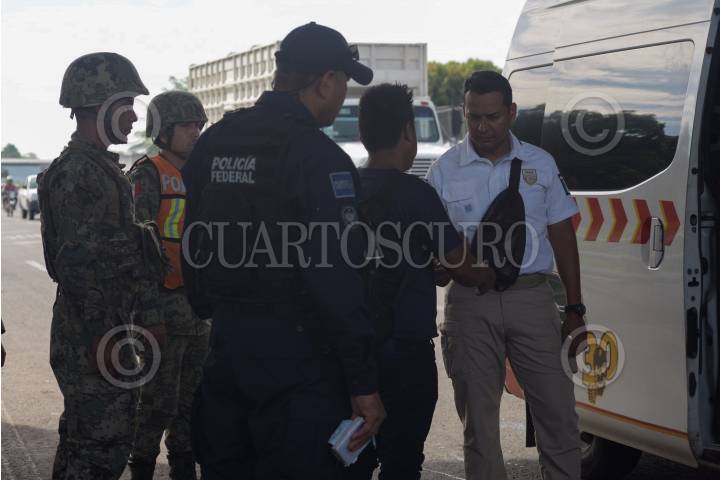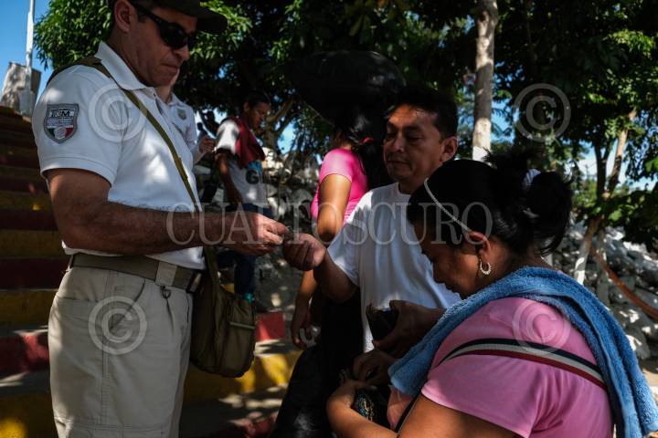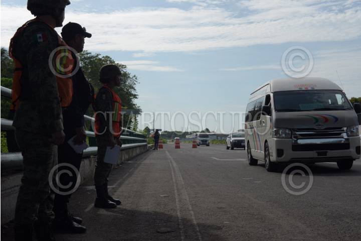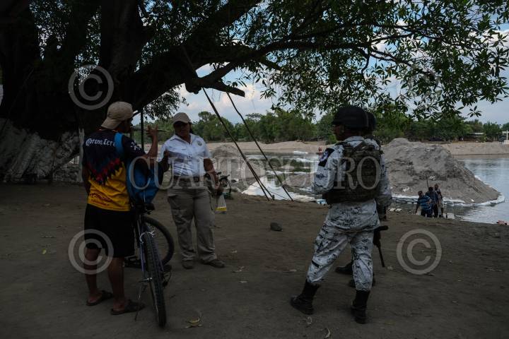 Agentes del Instituto Nacional de Migración y elemento de la Guardia Nacional mantienen un operativo de revisión de documento en las entradas del Río Suchiate.