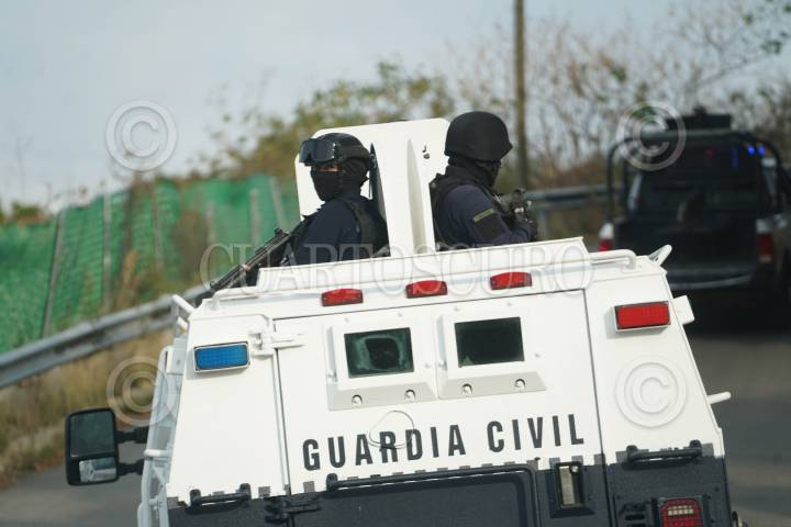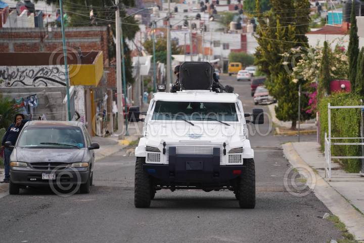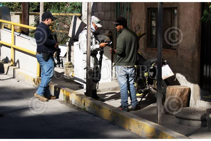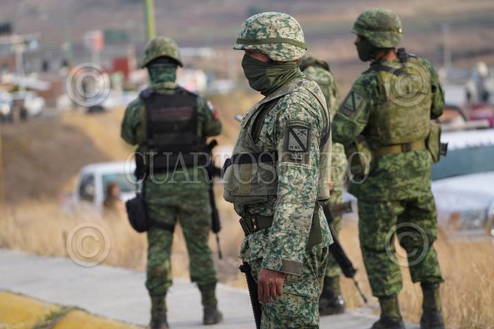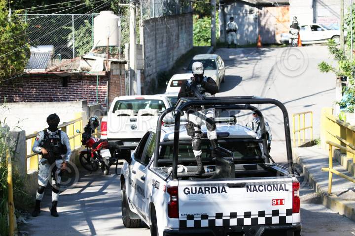 Elementos de la Guardia Nacional brindan proteccion a investigadores de la Fiscalía de Justicia en un operativo de cateo en un vivienda ubicada en la calle Conalep de la colonia Azteca en el municipio de Temixco.
