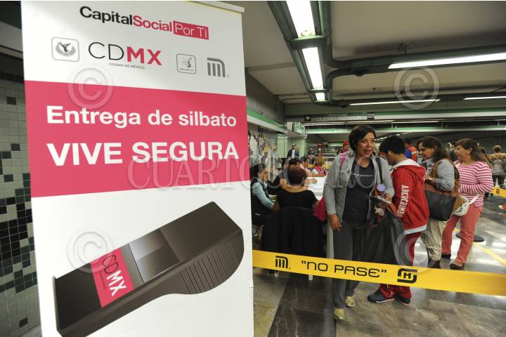 CIUDAD DE MÉXICO, 05JULIO2016.- Inició la entrega de silbatos para combatir las agresiones sexuales en el transporte público, en varias estaciones fueron entregados cientos de estos aparatos que buscan la inhibición del acoso sexual. Autoridades capitalinos entregaron la primera remesa de 15 mil silbatos a igual número de mujeres. FOTO: ARMANDO MONROY /CUARTOSCURO.COM