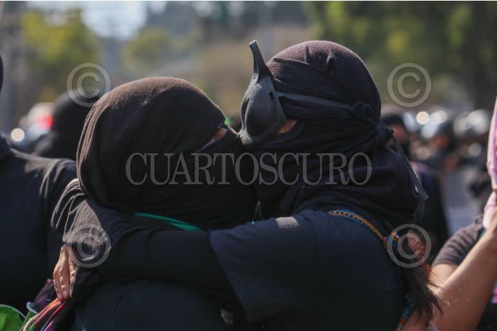 Un par de mujeres del Bloque Negro se besan durante el encapsulamiento del cual fueron objetos por parte de policías durante una manifestación que realizaron en las inmediaciones del IPN.