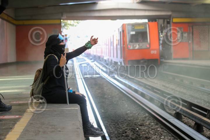 Mujeres integrantes del Bloque Negro toman un descanso en el metro, en donde realizaron diversas pintas. Ellas realizaron una manifestación en las inmediaciones del IPN para denunciar varios casos de acoso sexual que han quedado impunes en esa casa de es