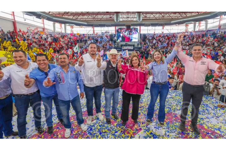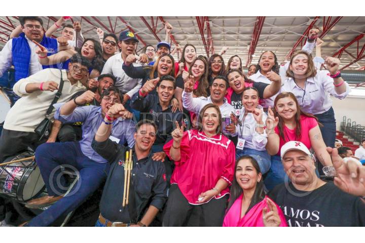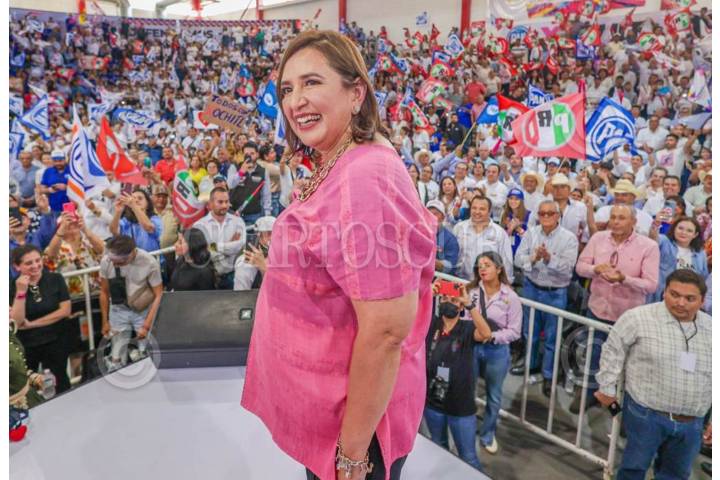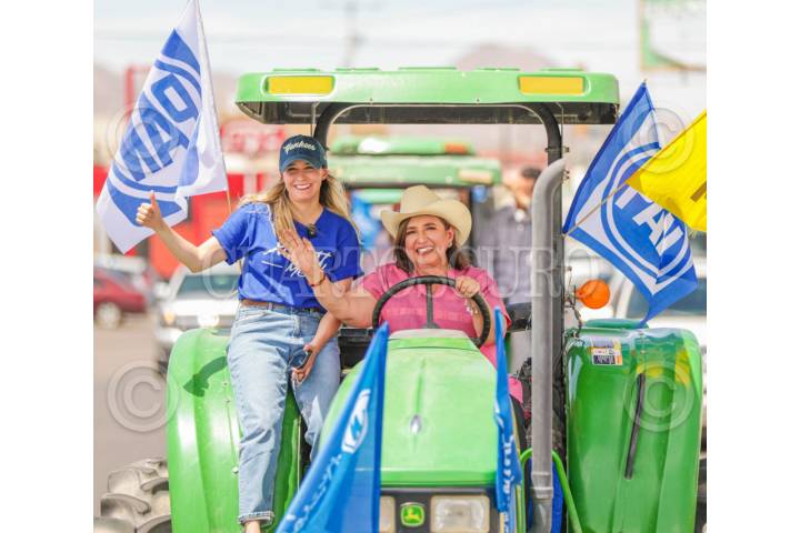 CAMARGO, CHIHUAHUA, 14ABRIL2024.- Xóchitl Gálvez, candidata a la presidencia de México por la coalición Fuerza y Corazón por México llegó a Camargo y fue recibida por 300 tractores y cientos de agricultores de la región. Fue en la entrada norte de Camargo, donde la panista bajó del XochiBus y decidió subirse a un tractor, para comenzar una caravana desde este punto hasta el poliforo municipal Víctor Valles Arrieta, sitio en el que ofreció un mensaje. FOTO: PRENSA XÓCHITL GÁLVEZ/CUARTOSCURO.COM