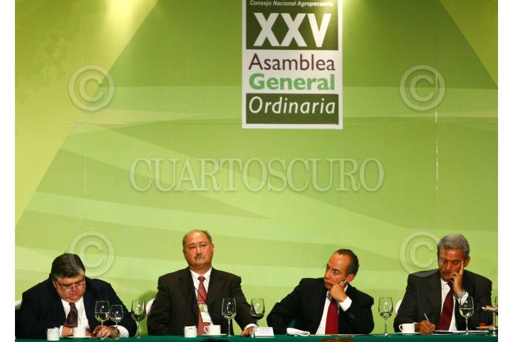 MÉXICO, D.F., 29JULIO2008.- El secretario de Hacienda, Agustin Carstens, Jaime Yesaki Cavazos, presidente saliente del Consejo Nacional Agropecuario, el presidente Felipe Calderon, y el titular de Sagarpa, Alberto Cárdenas, durante la comida de clausura de la Vigésima Quinta Asamblea General Ordinaria de dicho organismo. FOTO: ISAAC ESQUIVEL/CUARTOSCURO.COM