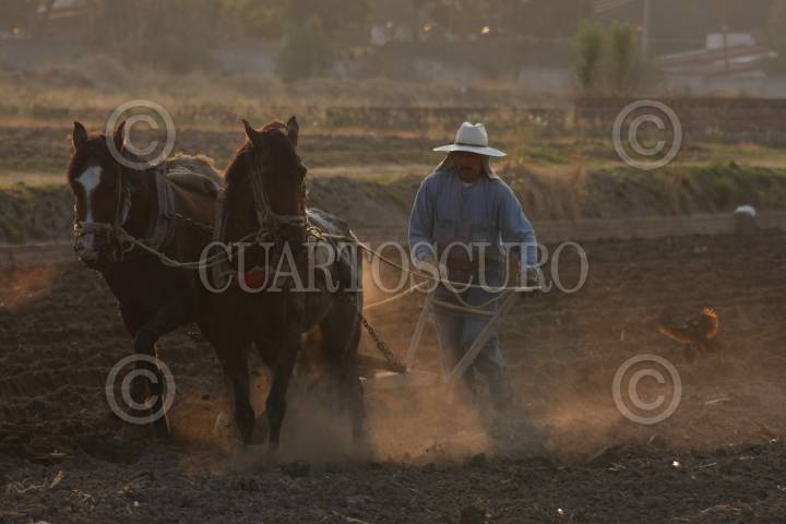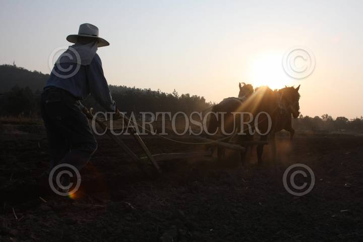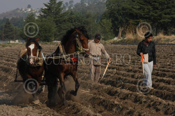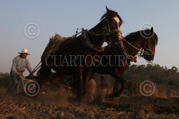 TLAXCALA, TLAXCALA, 01MAYO2011.- Desde primera hora de la mañana, campesinos de la región se dan a la tarea de sembrar maiz en los campos pertenecientes al ejido Totolac, ubicado en la zona centro del estado. En la imagen se observa el trabajo róstico de la yunta de caballos con los que se jala el arado. FOTO: J. GUADALUPE PÉREZ/CUARTOSCURO.COM