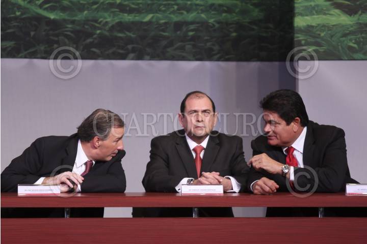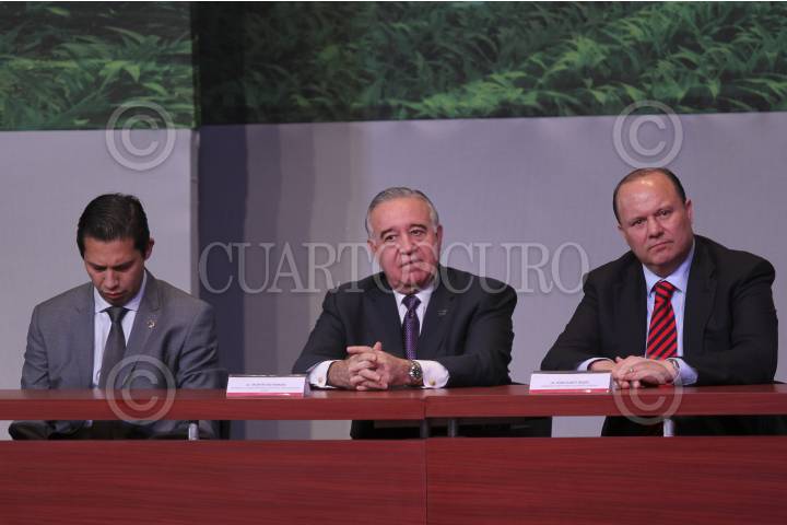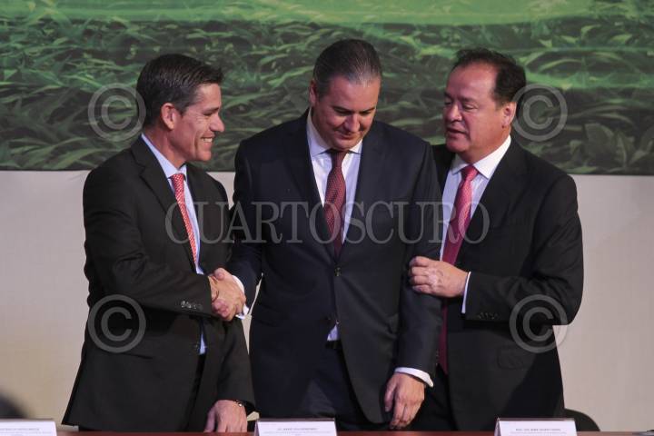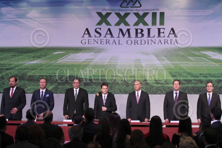MÉXICO, D.F., 17DICIEMBRE2015.- José Antonio Meade Kuribreña, Secretario de Desarrollo Social, Oswaldo Chazaro Montalvo, Presidente de la Confederación Nacional de Organizaciones Ganaderas y Mario López Valdez, gobernador del Estado de Sinaloa, XXXII Asamblea General Ordinaria del Consejo Nacional Agropecuario, la que fue presidida por Enrique Peña Nieto, presidente de México, Benjamín Grayeb Ruiz, Presidente del Consejo Nacional Agropecuario y José Eduardo Calzada Rovirosa, Secretario de Agricultura, Ganadería, Desarrollo Rural, Pesca y Alimentación. FOTO: ADOLFO VLADIMIR /CUARTOSCURO.COM