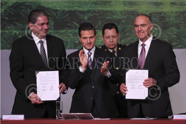 MÉXICO, D.F., 17JULIO2015.- Salvador Jara Guerrero, gobernador de Michoacán, César Horacio Duarte Jáquez, gobernado de Chihuahua, Enrique Peña Nieto, Presidente de México, y Eugenio Baeza Fares, presidente del consejo administrativo y director general del Grupo Bafar, durante el anuncio de inversión del Grupo Bafar en una planta agroindustrial en la Piedad, Michoacán, que se realizó en el salón Adolfo López Mateos de la Residencia de Los Pinos. FOTO: MOISÉS PABLO /CUARTOSCURO.COM