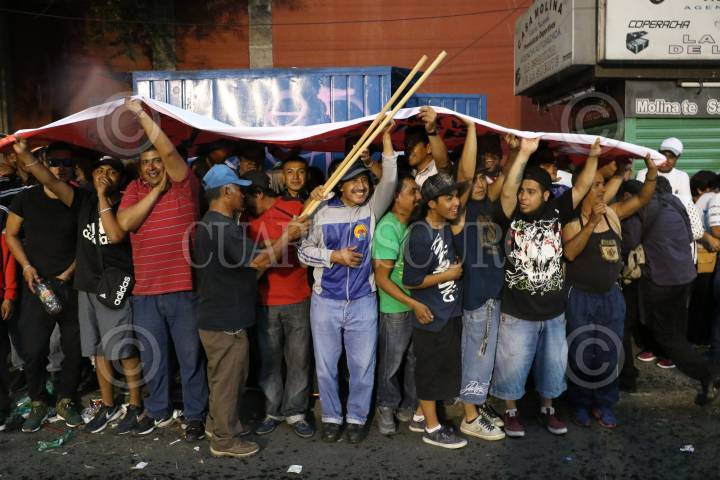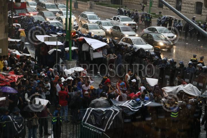 CIUDAD DE MÉXICO, 22ABRIL2018.- Una fuerte lluvia azotó el centro de la capital de la república, en la imagen decenas de manifestantes y militantes de partidos politicos se resguardan del aguacero en las inmediaciones del palacio de mineria donde se llevo acabo el primer debate presidencial. FOTO: SAÚL LÓPEZ /CUARTOSCURO.COM