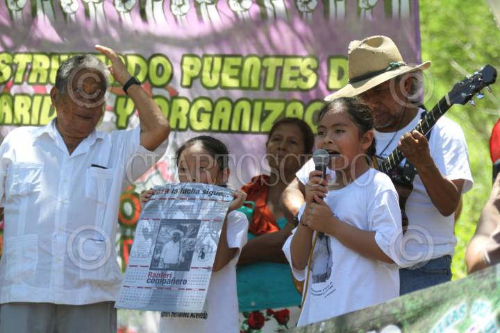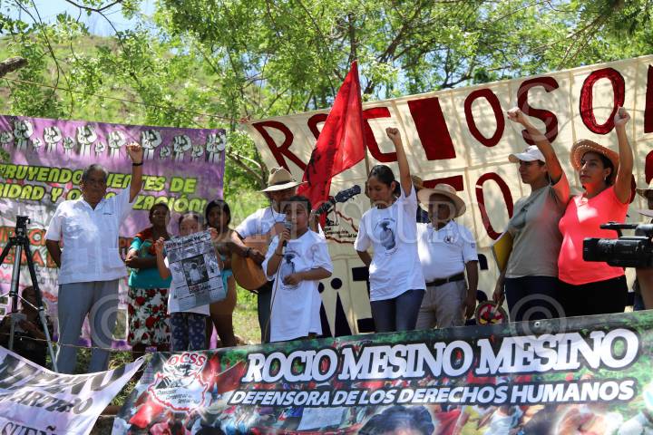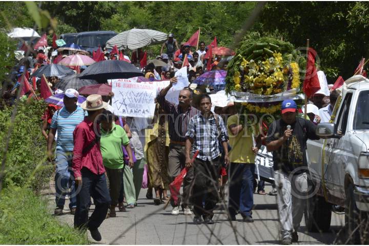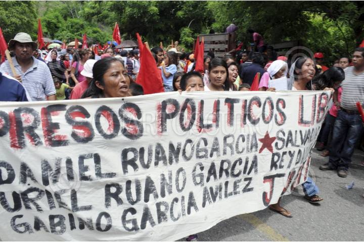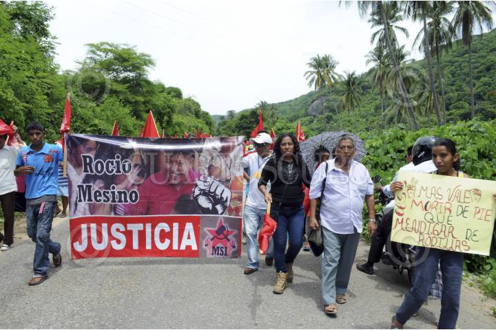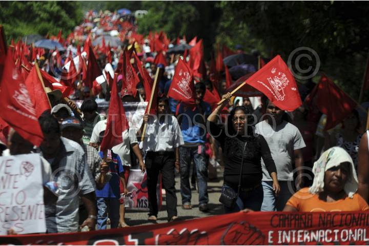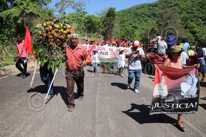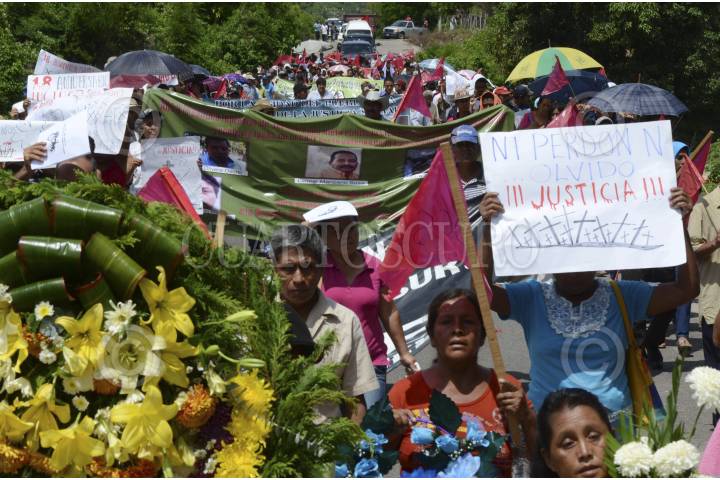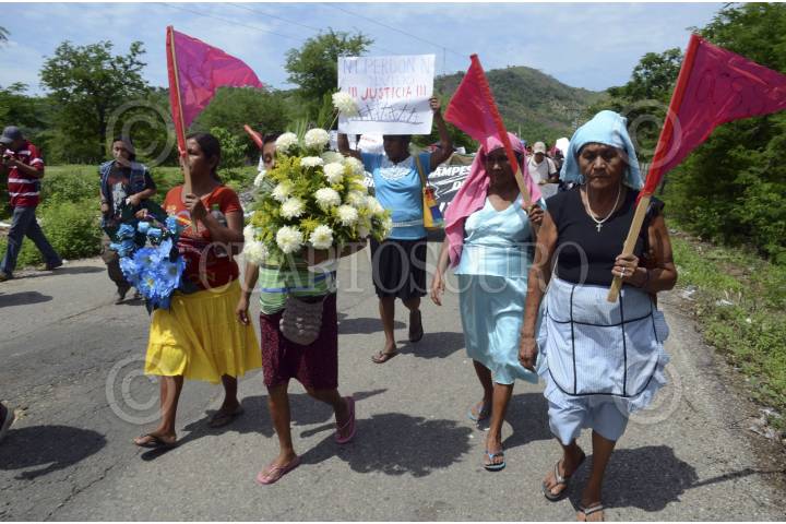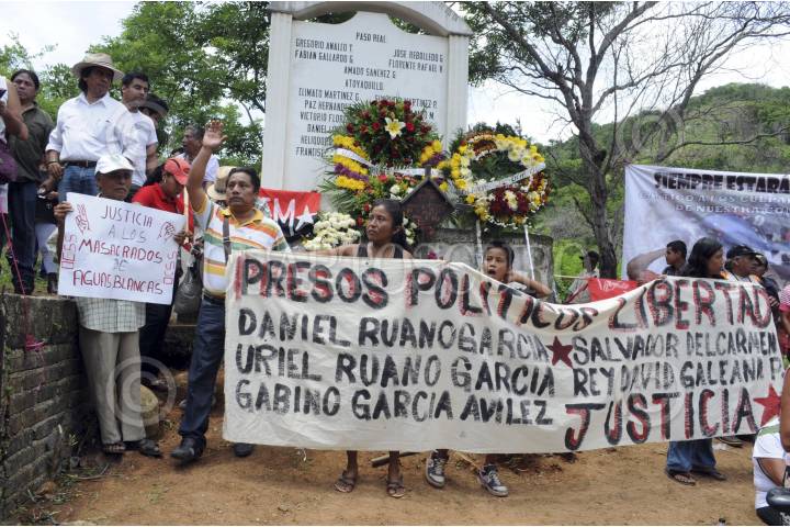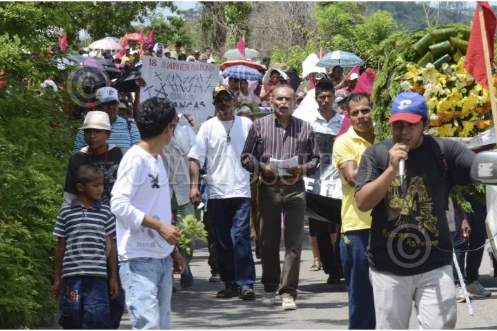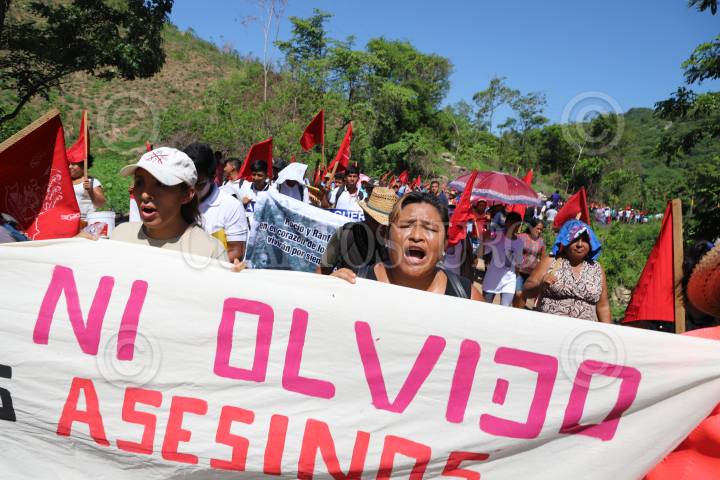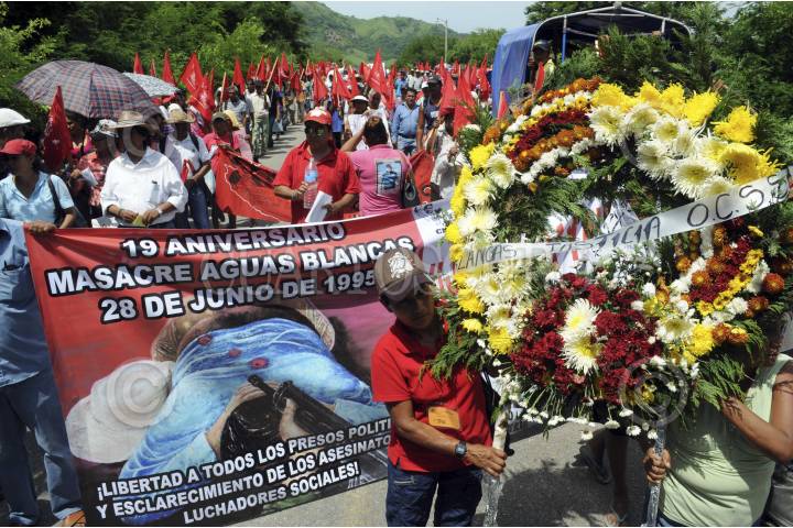 COYUCA DE BENÍTEZ, GUERRERO, 29JUNIO2014.- El día de ayer aproximadamente mil quinientas personas marcharon desde la comunidad de Aguas Blancas hacia el vado del mismo nombre, para conmemorar 19 años de la matanza de Aguas Blancas, en donde 17 campesinos pertenecientes a la Organización Campesina de la Sierra del Sur (OCSS) fallecieron en una emboscada en la que participaron elementos de la policía estatal motorizada, la mañana del 28 de junio de 1995. Las organizaciones sociales exigieron castigo a los responsables del hecho, de lo que señalaron al ex gobernador Rubén Figueroa Alcocer, además de exigir libertad de los presos políticos y el esclarecimiento de los asesinatos de luchadores sociales. FOTO: BERNANDINO HERNÁNDEZ /CUARTOSCURO.COM
