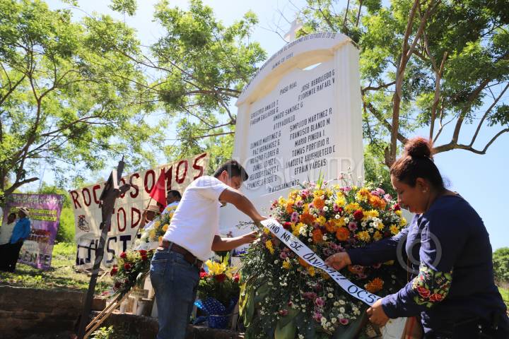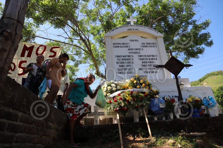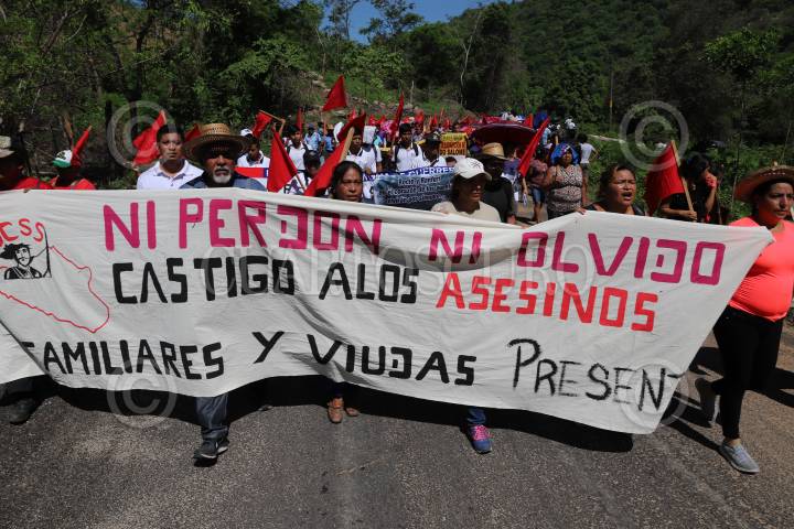 COYUCA DE BENÍTEZ, GUERRERO, 28JUNIO2019.- Marchan Integrantes de la Organización Campesina de la Sierra del Sur (OCSS) en el vado de Aguas Blancas, en este municipio de la región de Costa Grande, para conmemorar el aniversario 24 de la matanza de Aguas Blancas, en que fueron asesinadas 17 personas campesinos acribillados a manos de la policía estatal motorizada, en el periodo del ex gobernador de Guerrero, Rubén Figueroa Alcocer. Organizaciones exigieron al presidente de la República, Andrés Manuel López Obrador, retomar el caso Aguas Blancas y se castigue a los culpables del crimen, al recalcar que se trata de un crimen de Lesa humanidad. Al concluir la caminata, inició un acto cívico en el mausoleo dedicado a los campesinos asesinados, en donde se colocaron ofrendas florales veladoras. FOTO: BERNANDINO HERNÁNDEZ /CUARTOSCURO.COM