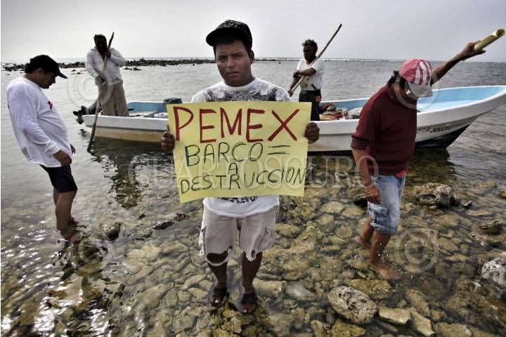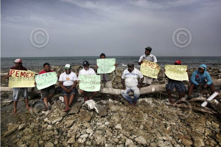 ALVARADO, VERACRUZ., 06AGOSTO2013.- Pescadores afectados por las implosiones generadas por el buque de bandera francesa utilizado por Petróleos Mexicanos para detectar yacimientos en aguas profundas se manifestaron en el arrecife "El Cabezo", lugar donde generalmente acudían a pescar. Los inconformes señalaron que debido a dichos trabajos las especies han ido muriendo y saliendo a flote en diversas partes de la costa veracruzana, sin embargo, la mayoría ha optado por migrar mar adentro generando una crisis en el sector pesquero. Los trabajadores marinos advirtieron que de no llegar a una solución bloquearán los recorridos del navío. FOTO: FÉLIX MÁRQUEZ / CUARTOSCURO.COM