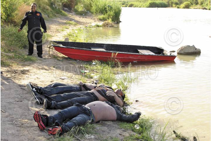 NUEVO LAREDO, TAMAULIPAS, 29AGOSTO2013.- Tres hombres fueron encontrados ahogados en el paso del Río Bravo por la capital tamaulipeca entre las calles de Hidalgo y Blvd. Luis Donaldo Colosio. Se sospecha que intentaban cruzar la frontera nadando con rumbo hacia Estados Unidos, y que podría tratarse de migrantes sudamericanos. Autoridades informaron que se trata de dos adultos y un menor de edad, quienes no han sido todavía reconocidos ya que no portaban ninguna especie de documento que avalara su identidad. FOTO: JOAQUÍN MURRIETA / CUARTOSCURO.COM