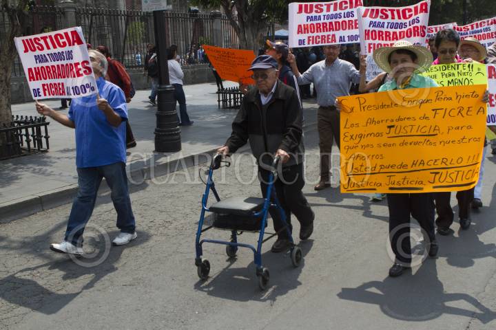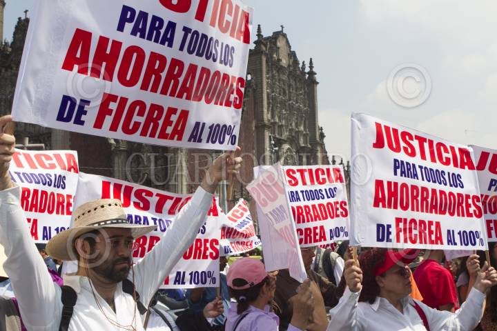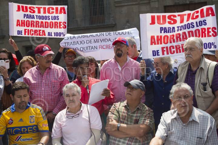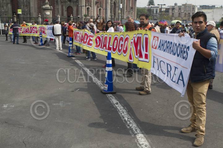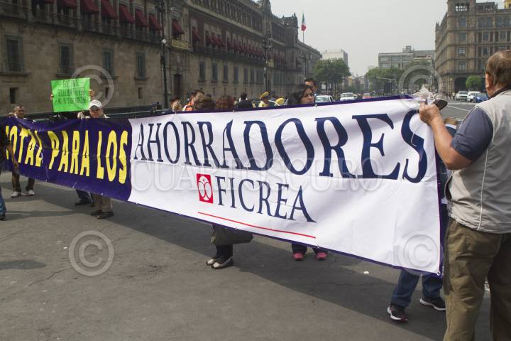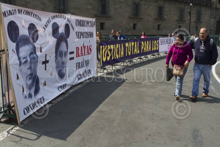 MÉXICO, D.F., 13MAYO2015.- Ahorradores defraudados por Ficrea se manifestaron frente al Palacio Nacional para pedir una audiencia con el secretario de Hacienda, Luis Videgaray. Ellos denunciaron que de los cien millones de pesos depositados en la sociedad financiera popular Ficrea, intervenida hace seis meses "se encuentran en un limbo jurídico y con riesgo de perderse" por una actuación "dilatoria y omisa" por parte de las autoridades encargadas de atender el caso. Actualmente el 85 por ciento de las personas que habían depositado recursos en la firma al momento de la intervención han presentado una solicitud para cobrar el seguro. FOTO: MOISÉS PABLO /CUARTOSCURO.COM