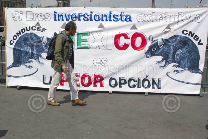 MÉXICO, D.F., 17JUNIO2015.- Enrique García, vocero de los ahorradores defraudados por Ficrea señalo que pidieron el respaldos de la Comisión Nacional de Derechos Humanos por irregularidades de organismo financieros en su calvarios para pode recuperar su dinero, durante la conferencia de prensa que dieron frente a Palacio Nacional. Los defraudados piden el 100 por ciento de sus ahorros defraudados por FICREA, señalaron que acudieron a esta instancia ante las irregularidades y abusos que han cometido en su contra las autoridades financieras del país. Recordaron que son 6, 848 familias ahorradoras las que se encuentran en situación de despojo, quienes señalan como una de las culpables de la situación en la que viven a la Secretaría de Hacienda, quienes debieron haber vigilado sus autoridades financieras. FOTO: MOISÉS PABLO /CUARTOSCURO.COM
