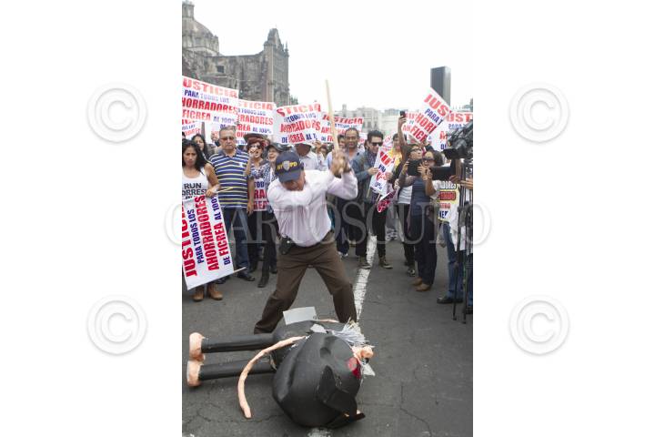 MÉXICO, D.F., 25JUNIO2015.- Ahorradores de Ficrea se manifestaron afuera de Palacio Nacional para exigirle a Luis Videgaray, secretario de Hacienda, el pago de sus ahorros al cien por ciento, tras ser defraudados hace algunos meses por esta empresa de fondo de ahorros avalado por la Comisión Nacional Bancaria y de Valores. En su protesta quemaron tres ratas con los letreros de la SHCP y CNBV. FOTO: MOISÉS PABLO /CUARTOSCURO.COM