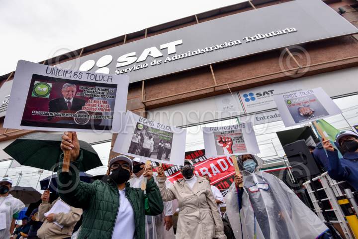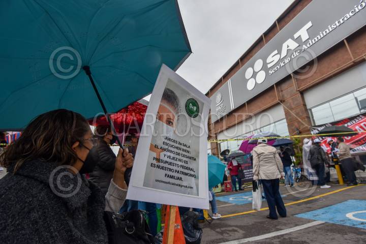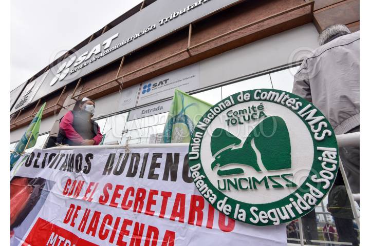 Jubilados y pensionados del IMSS se manifestaron en las primas del SAT en Toluca exigiendo el pago de su ahorro por cesantía y vejez.