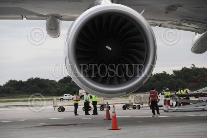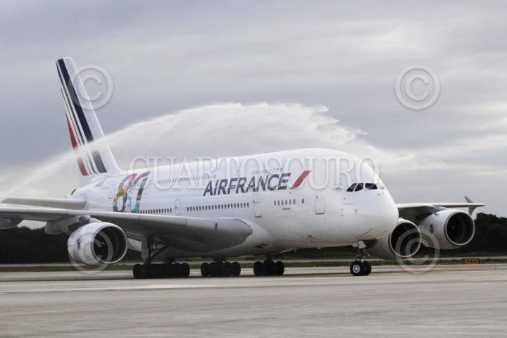 CANCUN, QUINTANA ROO, 27NOVIEMBRE2013.- El avión mas grande del mundo, el a380 de Air France, aterrizó por primera vez en México y América Latina, siendo el Aeropuerto internacional de Cancún donde se recibió esta tarde el vuelo procedente de Francia, el avión tiene una capacidad de 555 pasajeros y hasta 850 cuando se modifican a clase turista, tiene 2 pisos, mide 73 metros de largo y 79 de envergadura, por 24 de alto y se construyo por primera vez en el 2005, fue recibido por autoridades y público que fue invitado a ver este hecho histórico comparado con la llegada del concorde. FOTO: ELIZABETH RUIZ /CUARTOSCURO.COM
