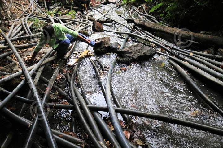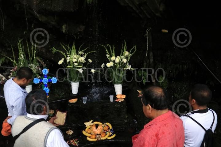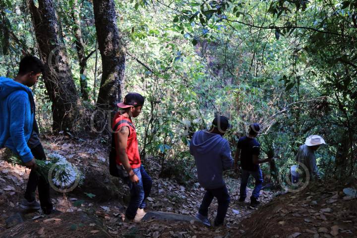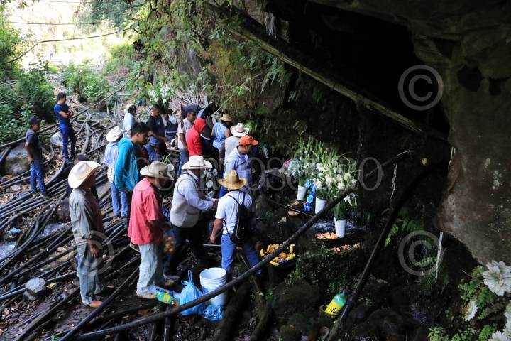 HUEYAPAN, MORELOS, 05MAYO2019.- El agua es el elemento vital, por ello se han desarrollado mitos en torno a ella. En Hueyapan, municipio indígena de reciente creación, pobladores se internan para llegar hasta el manantial Xantamalco, que aflora de las cavidades de una pared de piedra en la ribera del río Amatzinac, y que se alimenta del deshielo del Popocatépetl. Ahí llevan ofrendas de flores, dulces, galletas, velas, licor de agave y cigarros a “Los Aires”, duendes que viven en la profunda barranca. Desde los años 70, las personas han colocado líneas de manguera negra para conducir el líquido desde el manantial hasta sus casas, a través de la fuerza de gravedad. Con las ofrendas y rezos se busca que “Los Aires” garanticen el abasto durante el año. FOTO: MARGARITO PÉREZ RETANA /CUARTOSCURO.COM