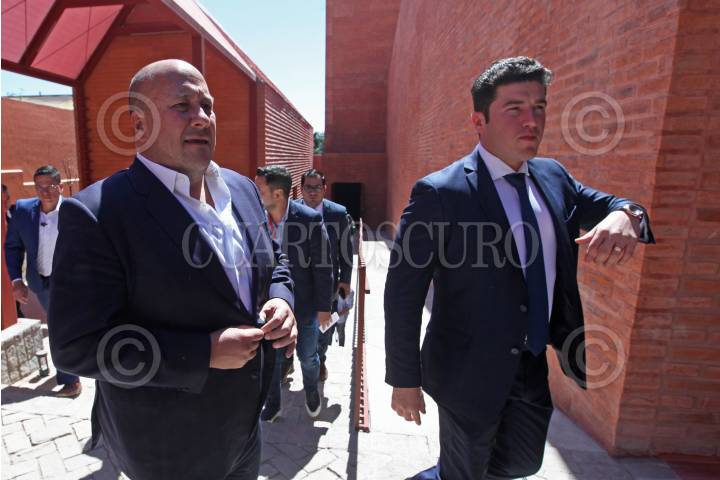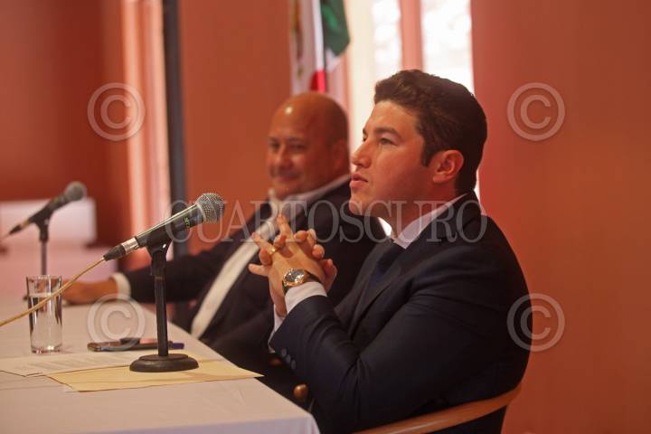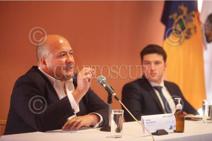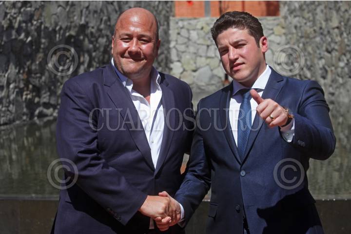 Los Gobernadores de Jalisco y Nuevo León, Enrique Alfaro Ramírez y Samuel García Sepúlveda, durante el mensaje relacionado a la firma de acuerdo entre ambos estados denominado Eje Empresarial Jalisco-Nuevo León, en el Centro para la Cultura y las Artes de la Ribera en Ajijic.