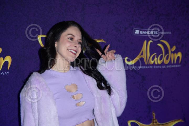 Andrea Torre durante la alfombra roja por las 450 representaciones del musical Aladdín, que se presenta en el Teatro Telcel.
