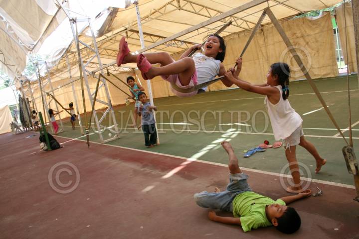 VILLAHERMOSA, TABASCO, 26FEBRERO2008.- A cinco meses de las contigencias por inundación, más de mil tabasqueños que resultaron damnificados permanecen en el albergue temporal de la unidad deportiva "Recreativo de Atasta". En el mencionado lugar juegan infantes y hacen su vida cotideana, sin embargo la mayoria de estas personas ya quieren retornar a lo que quedo de sus hogares. FOTO: MARCO POLO GUZMÁN HERNÁNDEZ/CUARTOSCURO.COM