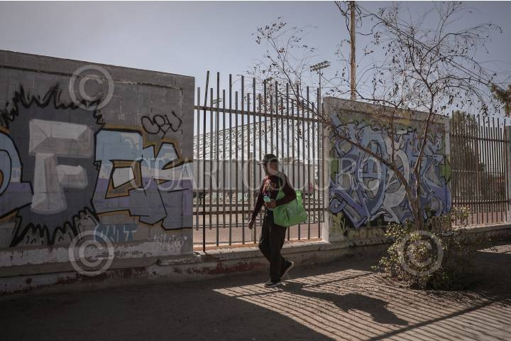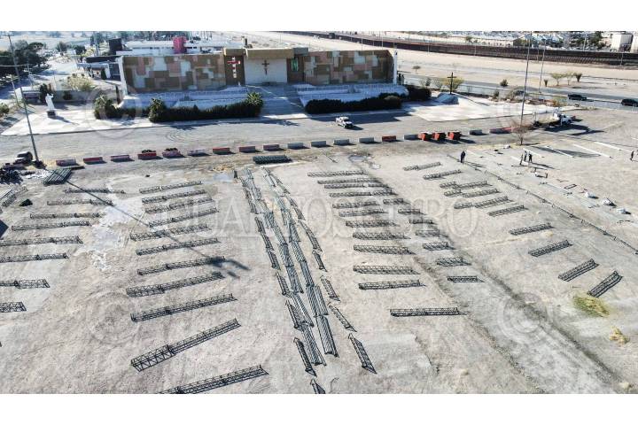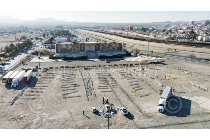 CIUDAD JUÁREZ, CHIHUAHUA, 21ENERO2025.- Tomas aéreas de los avances en los trabajos de construcción del albergue temporal en el área conocida como El Punto, el cual buscará atender a los migrantes deportados desde Estados Unidos. FOTO: MARIO JASSO/CUARTOSCURO.COM