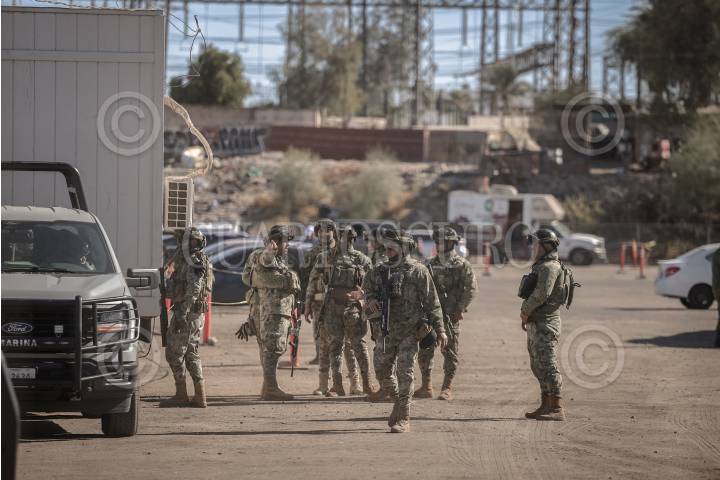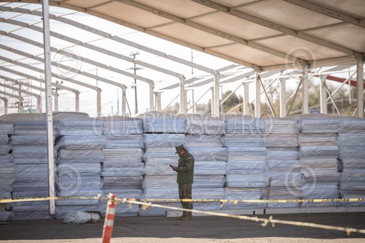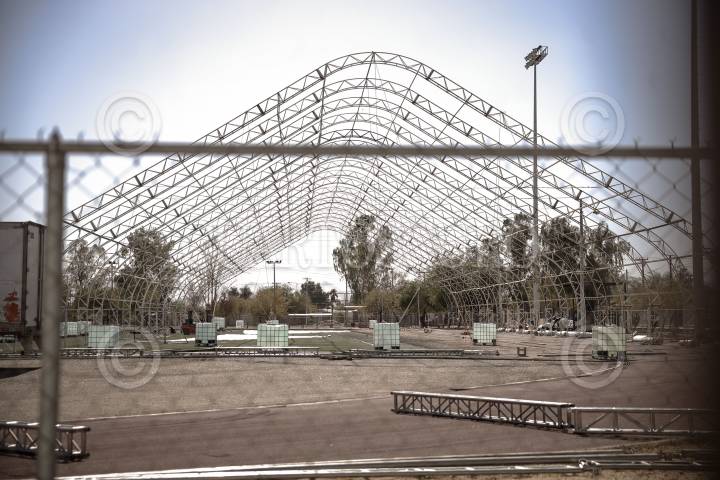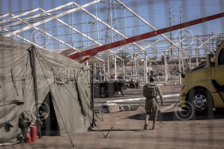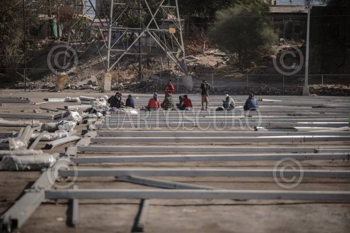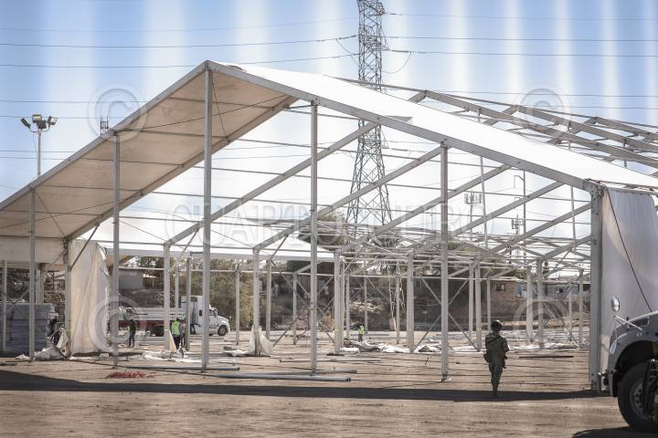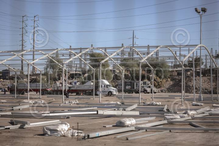 MEXICALI, BAJA CALIFORNIA 23ENERO2025.- Un par de albergues temporales se han habilitado sobre los terrenos el FEX y en el CREA, en Mexicali. El primero de estos para los migrantes, el segundo para los militares y soldados de la marina que lleguen a la ciudad, así como para ambulancias y demás equipo. Un total de seis carpas se levantará en el estacionamiento del FEX, con la posibilidad de aumentar el número de refugios dependiendo de la llegada de los migrantes. Según autoridades esto de presentarse el caso de las deposiciones masivas que se esperan desde la llegada de Donald Trump a la presidencia de Estados Unidos. FOTO: JACK ÁLVAREZ /CUARTOSCURO.COM