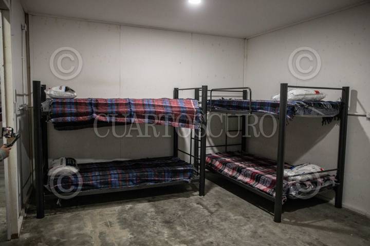 TIJUANA, BAJA CALIFORNIA, 27 de enero de 2025.- Literas al interior de un cuarto del albergue para personas repatriadas. A unos días de que se habilitara el albergue federal, alrededor de 36 hombres fueron llevados al lugar tras ser deportados la mañana de este lunes 27 de enero. En taxis de la ruta “centro”, blancos con dorado, los repatriados llegaron al salón Flamingos para ser atendidos. Algunos señalaron que ya habían sido deportados varias veces, pero que, debido a que tienen familia allá, siguen intentando cruzar “al otro lado”. Tal es el caso de un migrante originario de Guanajuato, quien comentó que esta es su cuarta deportación. Elementos de la Guardia Nacional y personal del Instituto Nacional de Migración fueron los encargados de recibir a los repatriados. FOTO: LUIS BAUTISTA/CUARTOSCURO.COM