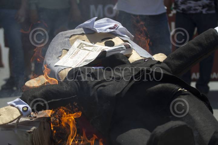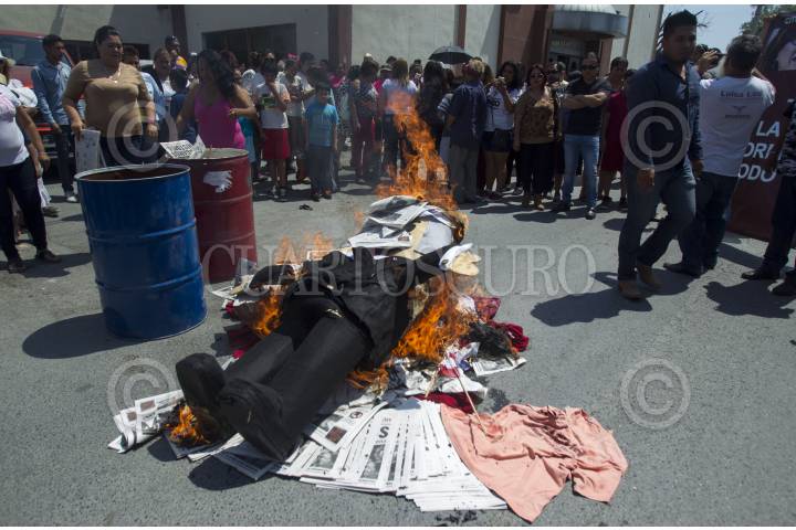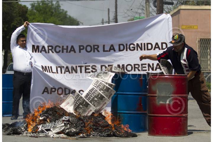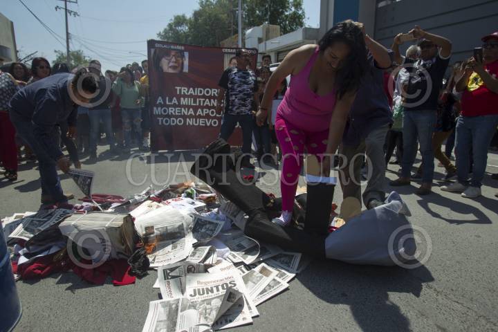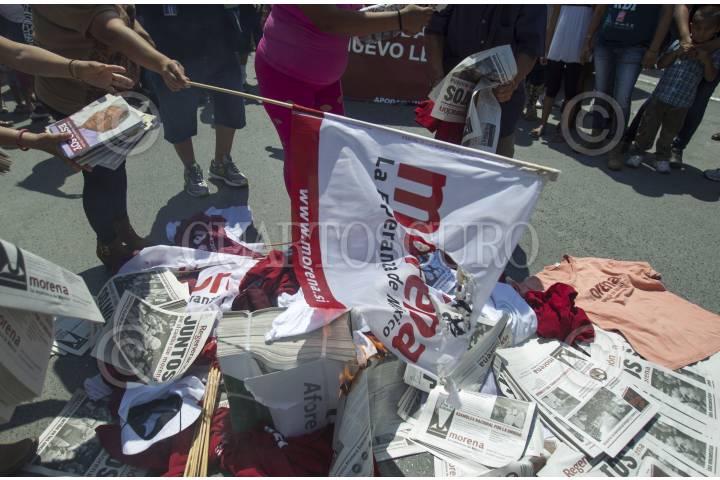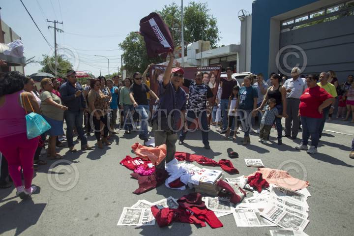 APODACA, NUEVO LEÓN, 25MARZO2018.- Candidatos a diferentes puestos, incluyendo alcaldía del municipio de Apodaca, así como alrededor de 8 mil militantes de MORENA; renunciaron al partido por destituciones de cargo y afiliar a ex priístas, panistas e independientes. En el acto, se quemaron banderas, camisetas y propaganda de AMLO y MORENA. FOTO: GABRIELA PÉREZ MONTIEL /CUARTOSCURO.COM