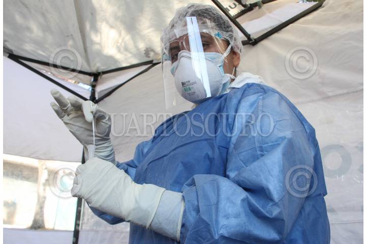 Una mujer durante proceso de toma de muestra nasal, para la detección de COVID-19.