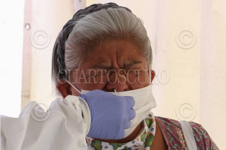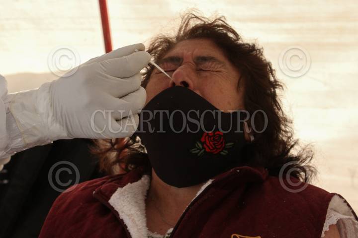 Mujer durante toma de muestra nasal para la detección de COVID-19 en el Kiosco de la Salud.