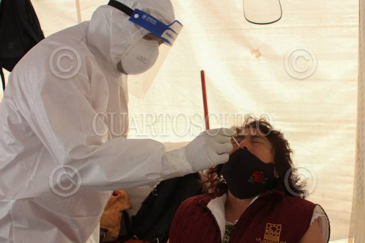 Mujer durante toma de muestra nasal para la detección de COVID-19 aplicada en pruebas rápidas.