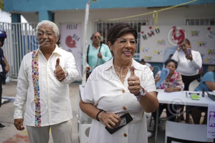 VERACRUZ, VERACRUZ, 01JUNIO2025.- La candidata a la alcaldía de Veracruz por Morena, Rosa María Hernández Espejo, acudió a emitir su voto en la casilla 4390, ubicada en la escuela primaria Divina Morales de Tamiahua, en la Unidad Habitacional El Coyol. FOTO: VICTORIA RAZO/CUARTOSCURO.COM