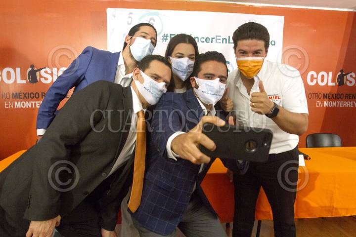 Samuel García, candidato a la gubernatura de Nuevo León por Movimiento Ciudadano, se toma una fotografía con representantes de asociaciones para apoyo del cáncer.