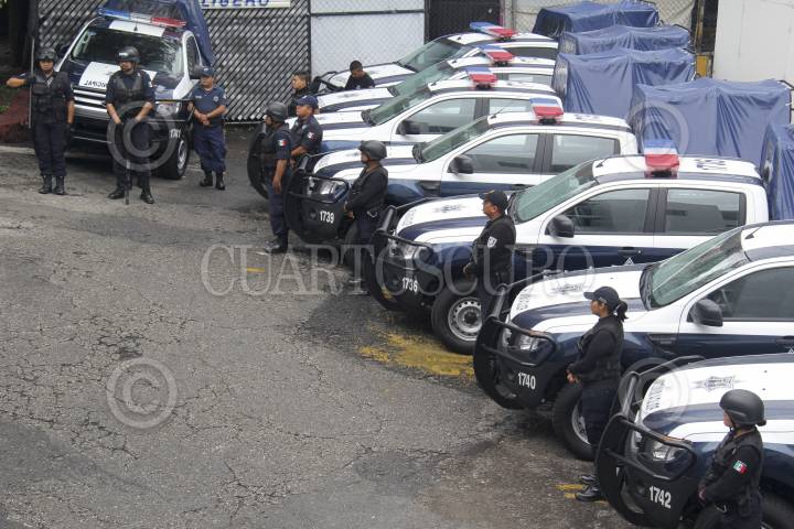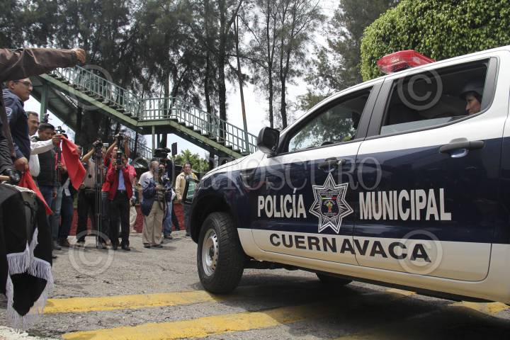 CUERNVACA, MORELOS, 03AGOSTO2014.- El alcalde de Cuernavaca, Jorge Morales Barud entregó esta tarde 12 patrullas a elementos de la policía metropolitana durante una ceremonia en la que se realizaron los honores a la bandera. Durante el acto estuvo presente René Hernández Salgado, titular de la Secretaría de Seguridad Ciudadana capitalina. FOTO: PATRICIA MORALES /CUARTOSCURO.COM