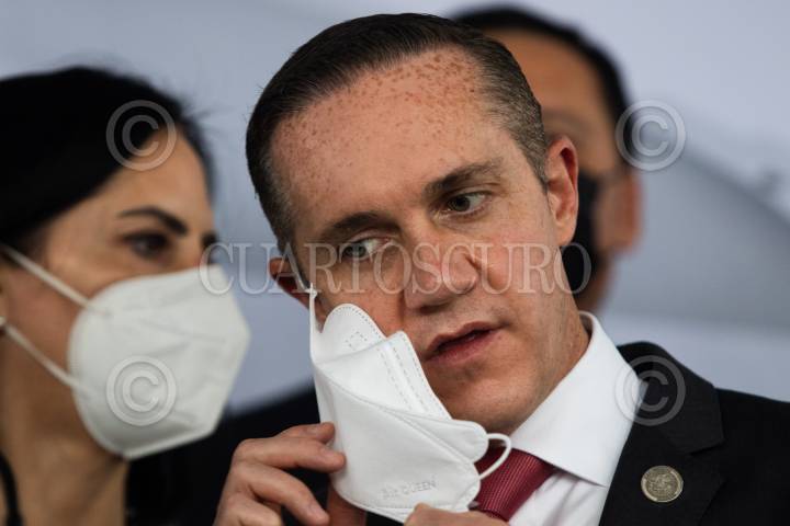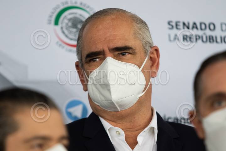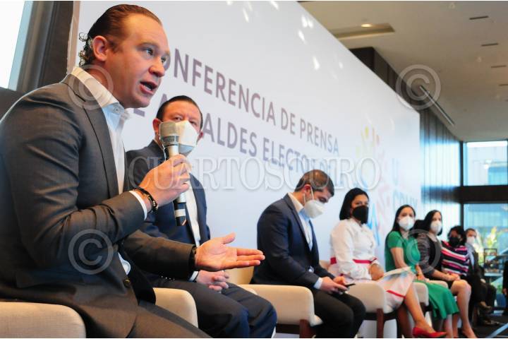 Santiago Taboada, alcalde electo de Benito Juárez; durante la conferencia de prensa tras finalizar el encuentro entre alcaldes electos de oposición y las bancadas del PRD, PRI y PAN.